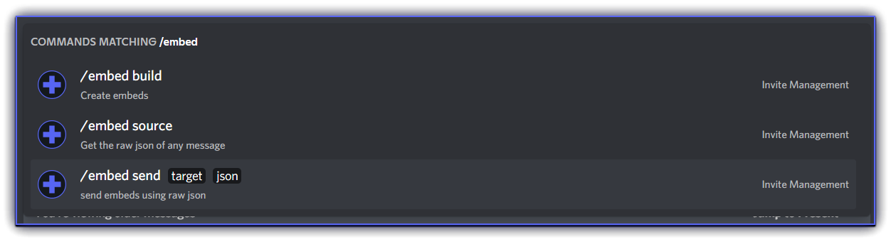 embed/embed send <channel> <json>- Sends an embed message constructed using the json file provided to the specified channel/embed build <json>- Opens an interactive interface that allows you to design embeds. A json file can also be provided to edit that embed instead of starting from scratch/embed source <id>- Gets the raw json of a message from the current channel with the specified id