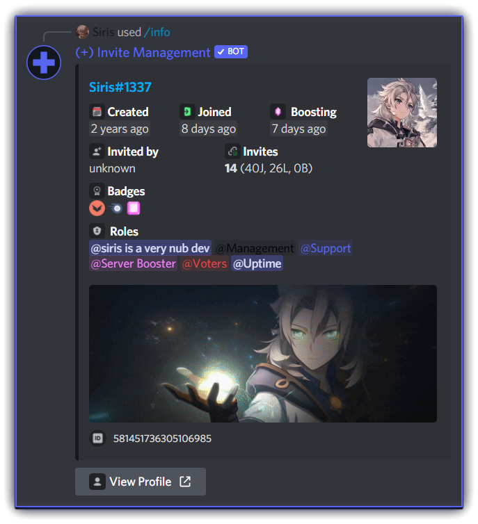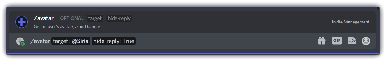 avatar/avatar <target> <hide-reply>- Shows the avatar, server avatar and banner of the target user, ifhide-replyistruethe response will be ephemeral (can be seen only by you)
