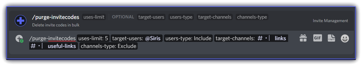purge-invites/purge-invites <uses> <targetUsers> <usersType> <targetChannels> <channelsType>- Mass delete invite links<uses>invite links with uses less than or equal to this number will be deleted<targetUsers>is optional and defaults to all users<usersType>whether to include or exclude the users mentioned in<targetUsers><targetChannels>is optional and defaults to all channels<channelsType>whether to include or exclude the channels mentioned in<targetChannels>